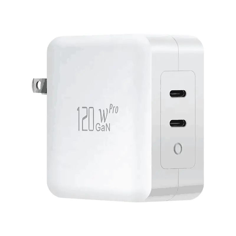 Adaptatore di ricarica rapida compatto con doppie porte USB-C, che fornisce fino a 120W di potenza totale per laptop, tablet e altri dispositivi elettronici.